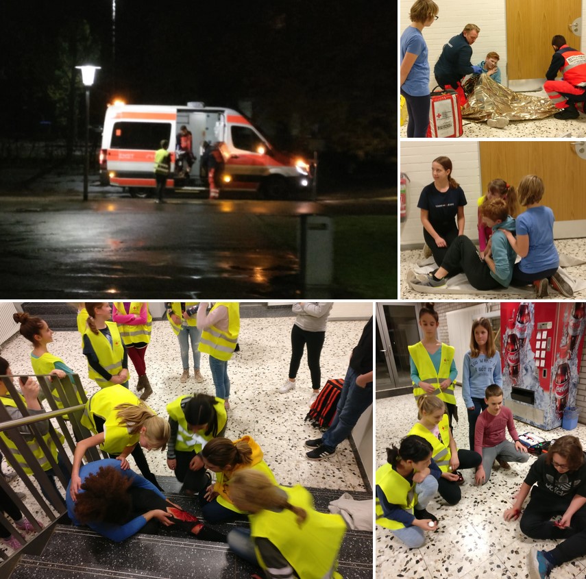 Die gespielten Notfälle umfassten eine Verletzung der inneren Organe im Bauchbereich mit Bluten aus dem Mund, eine stark blutende suizidale Verletzung mit einer Schere, eine Verbrühung und Verbrennung des Oberarmes, eine Daumenamputation in der Schulküche, im Schock durchdrehende Beteiligte, einen offenen Bruch am Schienbein auf der Schultreppe, zuckende Krampfanfälle sowie einen Herzinfarkt eines „Lehrers“. Hier kam zu aller Überraschung nach der Ersthilfe unseres Teams sogar der echte Krankenwagen mit einem Notfallsanitäter und einem Rettungssanitäter. Diese legten vor Ort ein EKG an und erklärten alles, was in so einem Fall vor sich geht und alle Fragen der Teilnehmer.